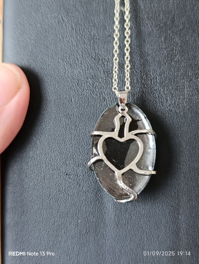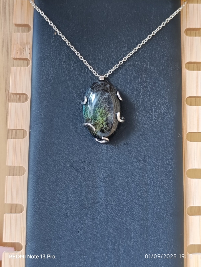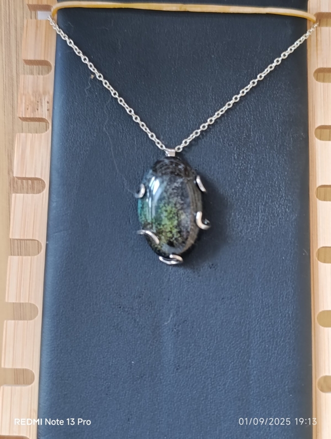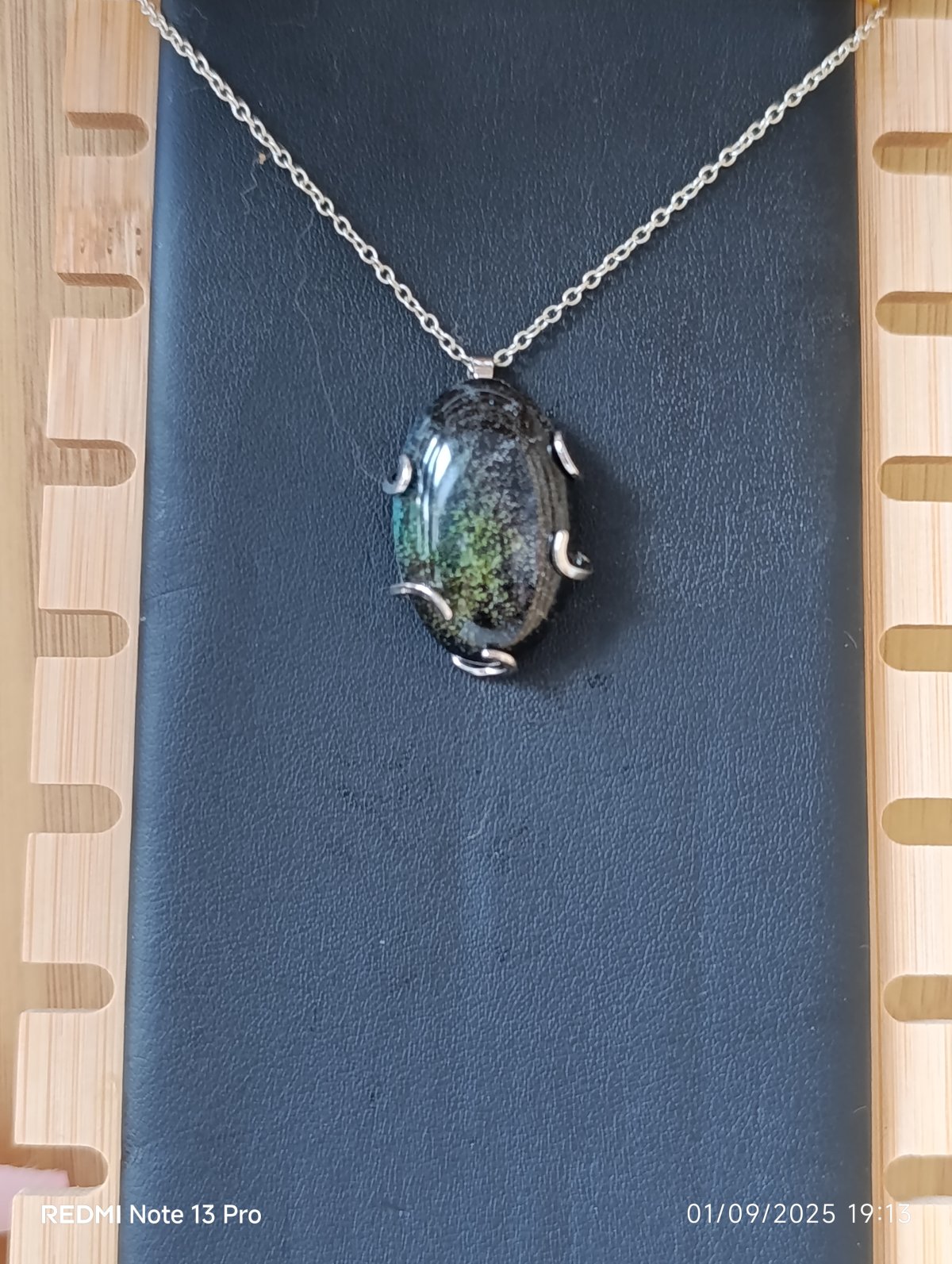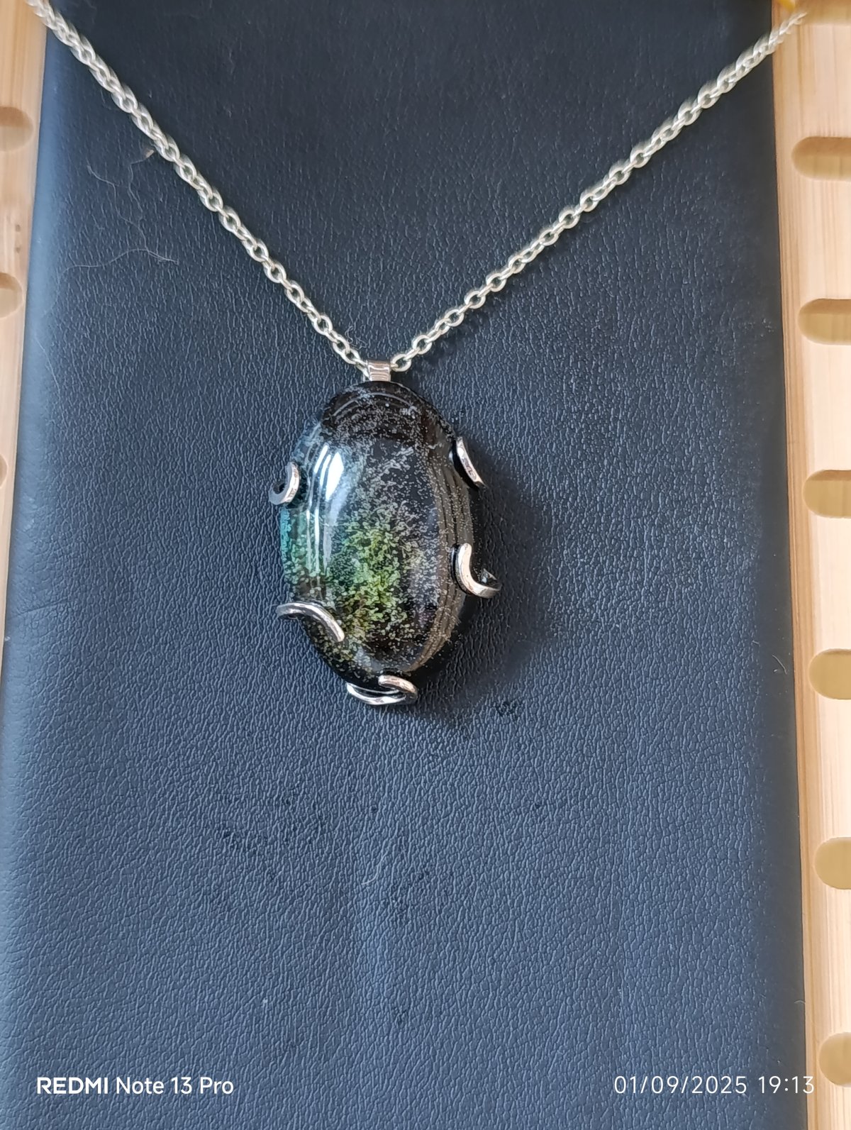 Ce pendentif est unique et monté sur un ornement en acier et une chaîne en argent 925.