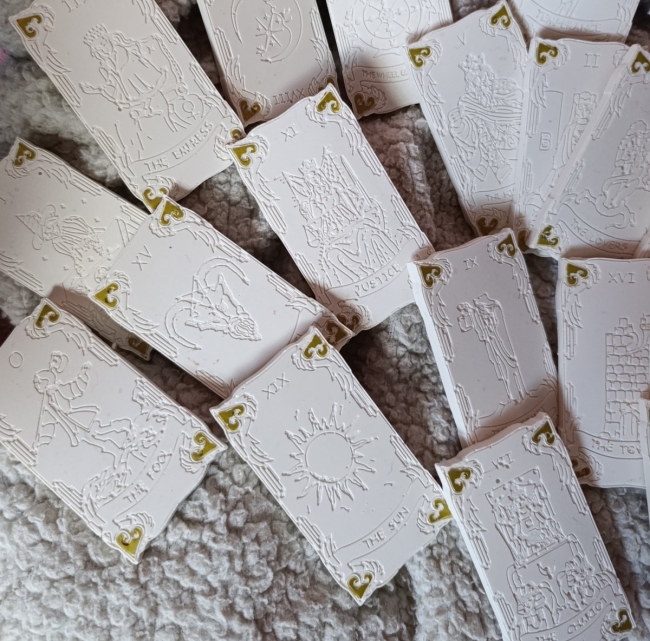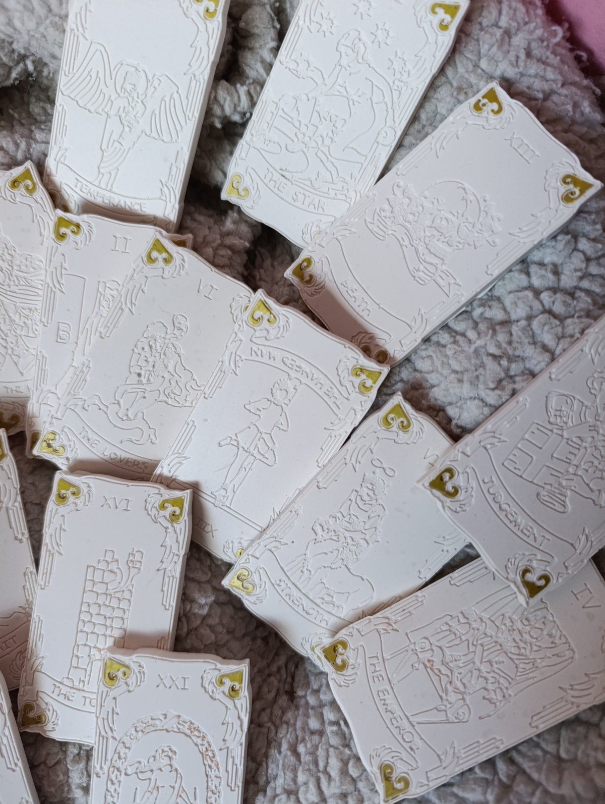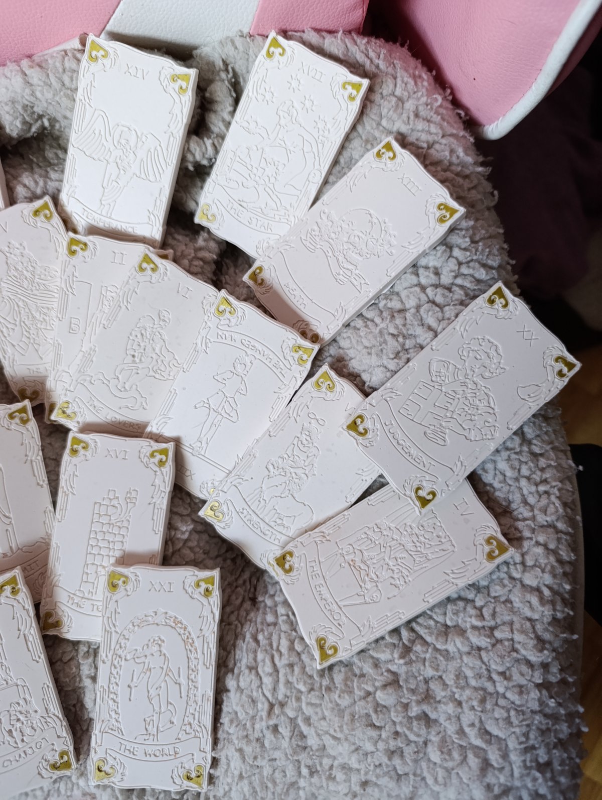 Je suis tellement heureuse de vous présenter mon tout dernier projet : un jeu complet des Arcanes Majeurs du Tarot, entièrement réalisé en Jesmonite !